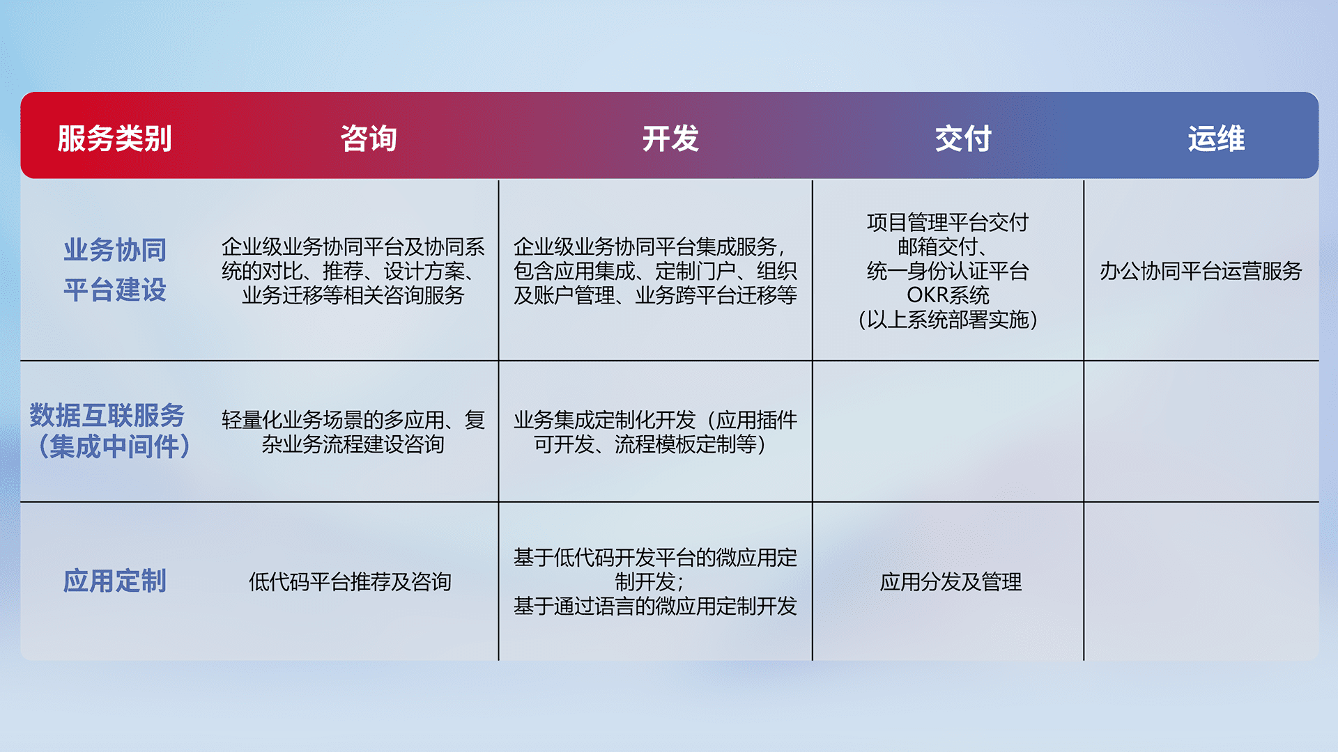 针对钉钉、、企微、、、、IDaas等平台级产品提供产品的规划、、、、方案、、交付、、定制化开发等服务,,实现如统一协同办公、、智能客户服务、、、混合会议管理、、智能数据查询、、、等业务场景,,实现数字化转型。。。